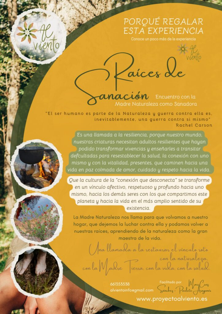 Este encuentro está diseñado para sanar heridas vitales a través de la naturaleza, utilizando diversas prácticas que fomentan la introspección y la creatividad. Enfocado para ayudar entre otros, a padres, madres, profesionales de la educación y la sanidad, y políticos.